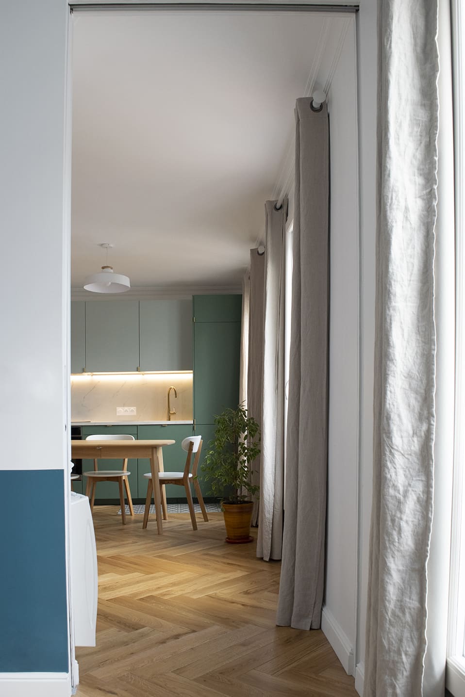 La demande initiale était de refaire à neuf le logement et penser une nouvelle organisation des espaces. L’appartement a donc été repensé pour offrir à la fois de la lumière, des espaces de rangement et une sensation d'espace plus généreux.